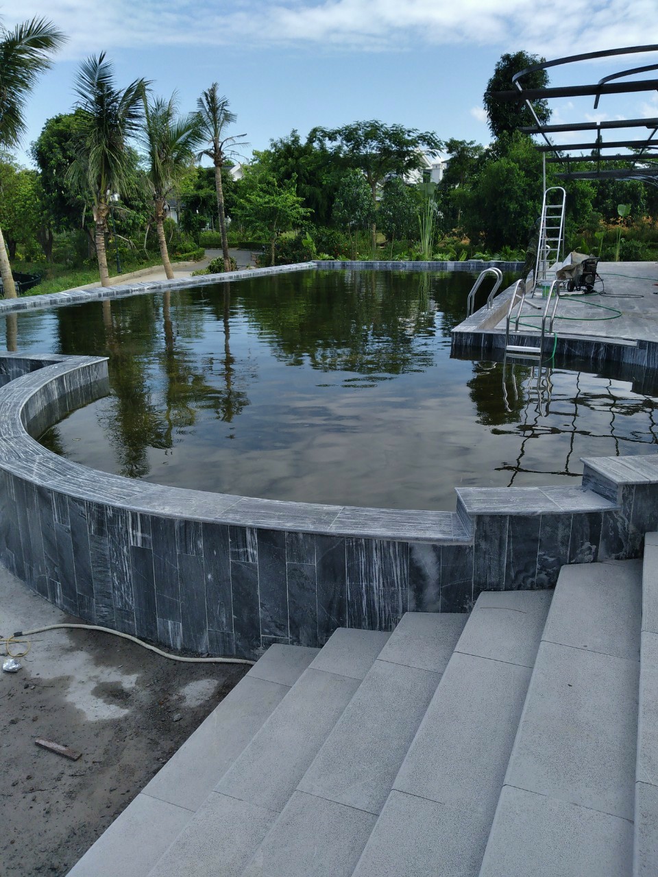 Đá sọc dưa đen mài bóng tự nhiên đạt các tiêu chuẩn về độ bền, thẩm mĩ không bị phai màu, xuống cấp theo thời gian là một lựa chọn lý tưởng trang trí ốp lát hồ bơi hoàn thiện.