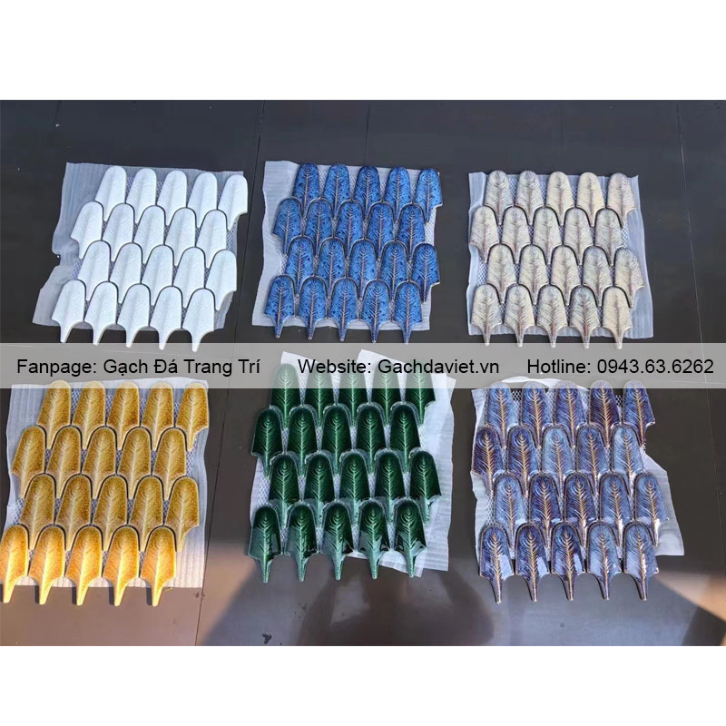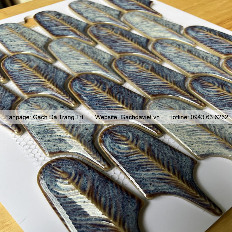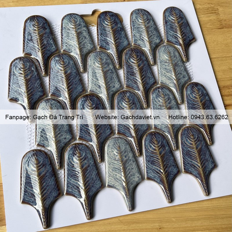 Gạch mosaic lông vũ là sự kết hợp hoa văn xương lá đặc biệt mô phỏng kết cấu lông chim công với gam màu đậm bắt mắt. Đây là bộ gạch dành riêng cho các nhà thiết kế nội thất và kiến trúc sư, giúp tạo ra không gian ấn tượng không giới hạn.