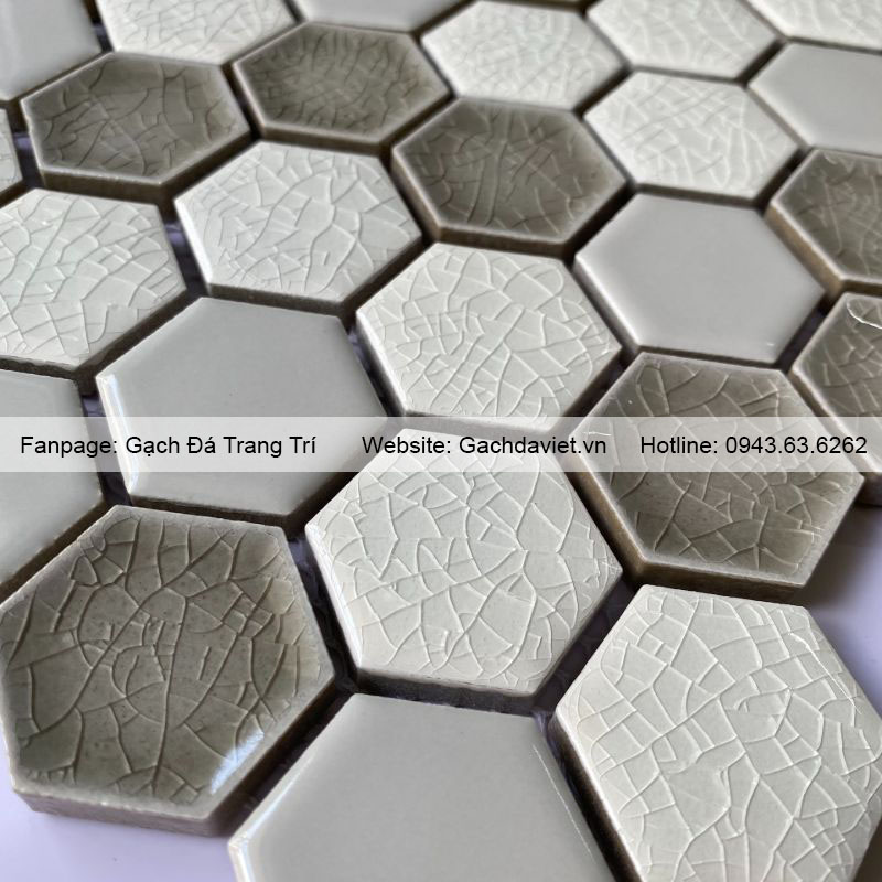 Gạch mosaic lục giác có dạng hình học khá độc đáo như chính cái tên của chúng. Loại gạch này cũng được chế tác từ nhiều loại chất liệu khác nhau; có thể là gạch men ceramic, gạch porcelain, gạch granite, đá tự nhiên... Vì vậy, chúng thường được sử dụng để làm gạch mosaic lát sàn và cả ốp tường