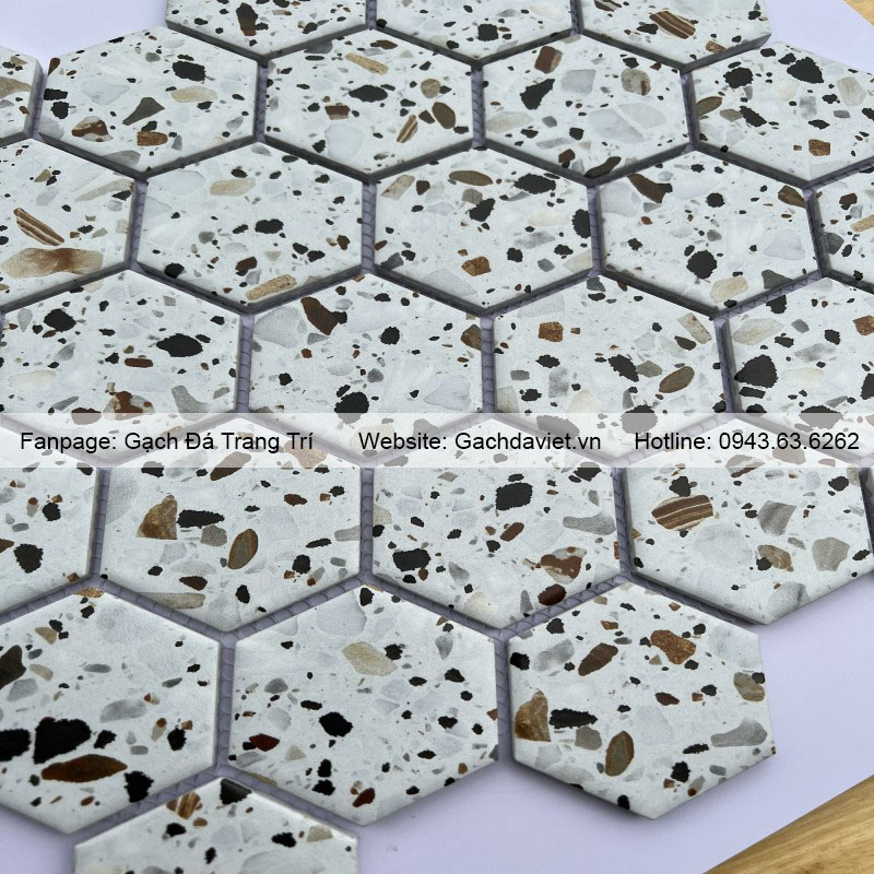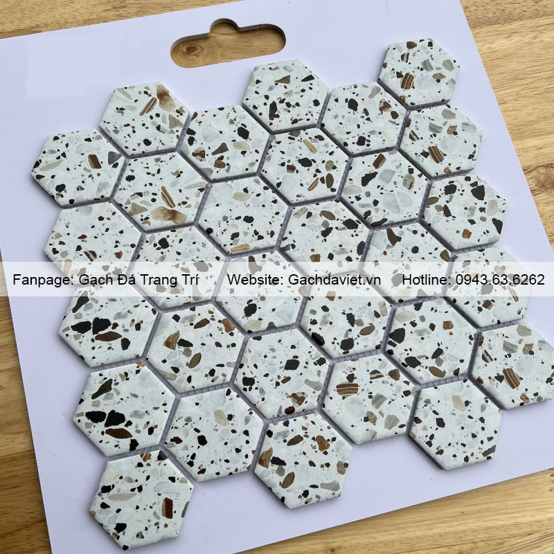 Gạch mosaic lục giác là mẫu vật liệu ốp lát được làm bởi nhiều viên gạch hình lục giác kích thước nhỏ liên kết với nhau tạo thành các vỉ gạch. Gạch có màu sắc đa dạng, có thể tạo hình nên rất được ưa chuộng sử dụng trong việc trang trí. Công trình xây dựng trong nhà và ngoài trời sử dụng vật liệu đảm bảo độ bền cao cùng tính thẩm mỹ nổi bật.