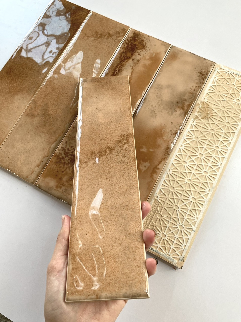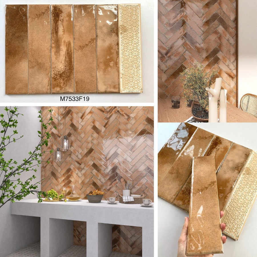Gạch thẻ được làm từ chất liệu chính là gạch men – Ceramic, bề mặt bóng ,được ưa chuộng nhất trong khoảng thời gian gần đây.